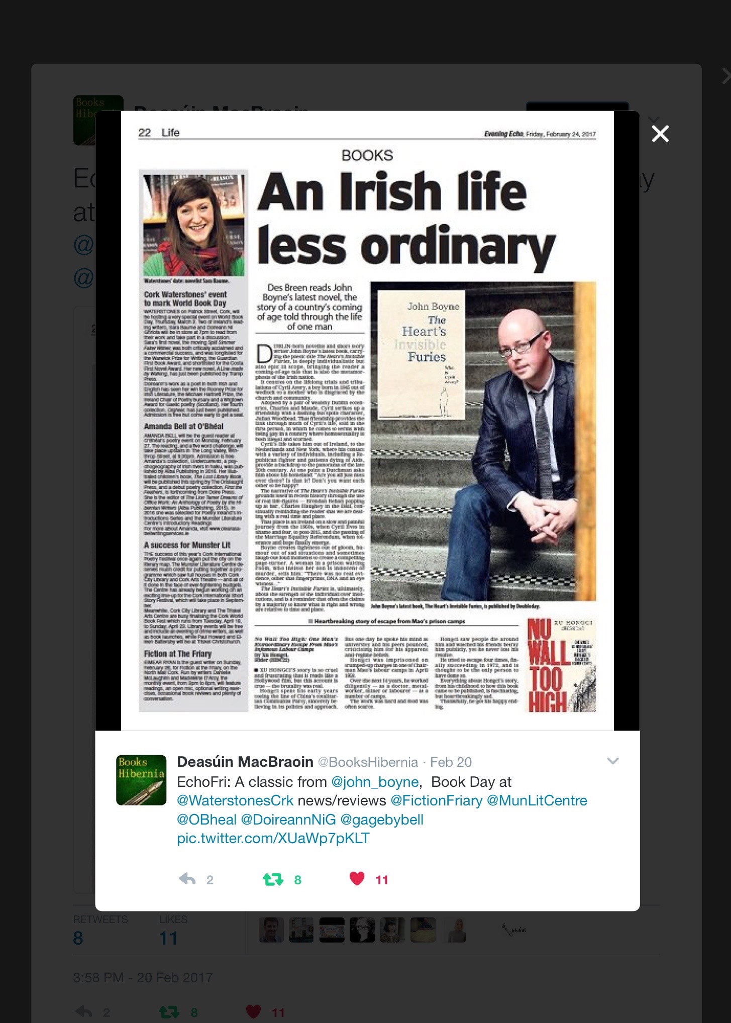 Reading at Ó Bhéal for the first time on Monday 27th February was a wonderful experience – lovely crowd, great hospitality, and delighted also with this piece by Deasúin MacBraoin in the Evening Echo