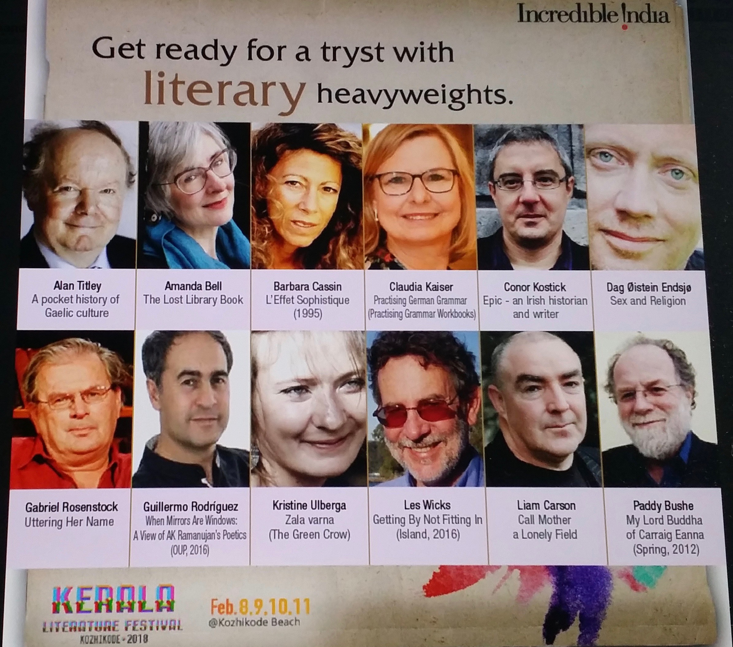 Some highlights of the wonderful Kerala Literature Festival: ‘No Democracy Without Dissent’, 8-11 February 2018, in Kozhikode Beach. Ireland was the guest country, and I attended with Conor Kostick, Alan Titley, Gabriel Rosenstock, Paddy Bushe, and Liam Carson, with the generous support of Culture Ireland.