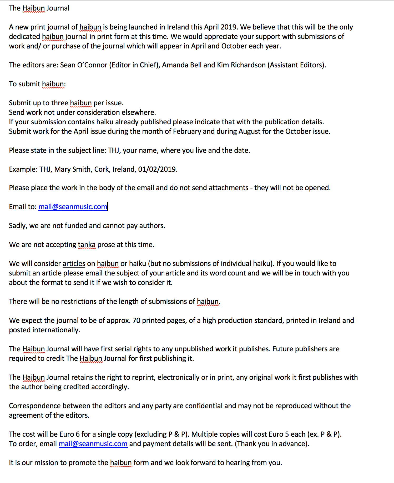 She also has work in the autumn/winter issues of The Haibun Journal, The Storms, The Four Faced Liar, and Blithe Spirit. She recorded a haibun called ‘The Oldcastle Bell’ for Sunday Miscellany, which was broadcast on 3 November.
