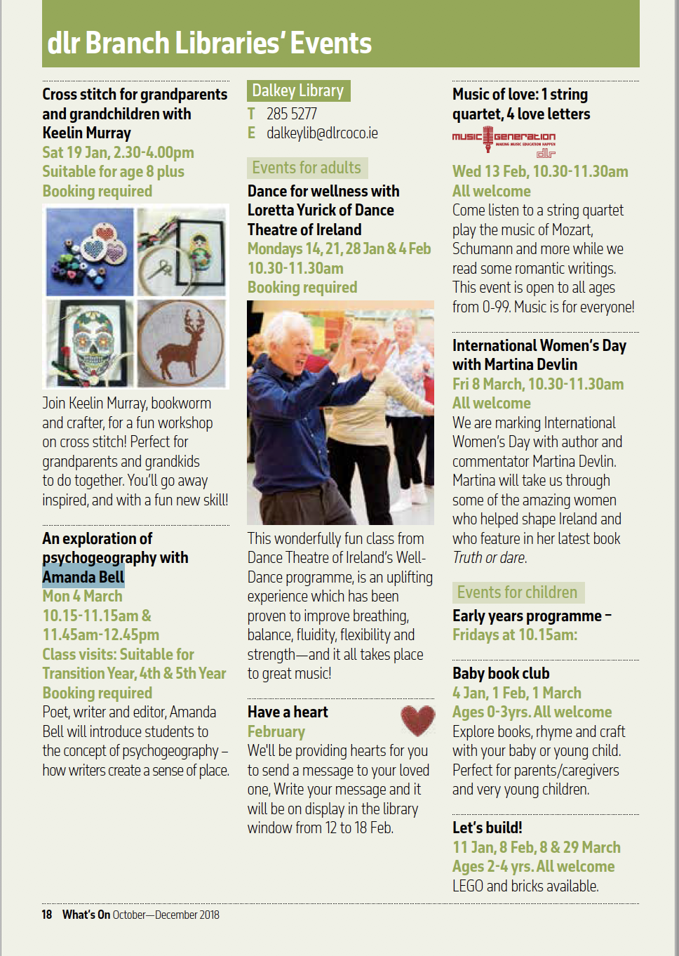 She appeared at Holocaust Awareness Ireland’s event in Dublin Castle on 28th September, reading ‘Visible Mending’ a commissioned response to ‘The Objects of Love’ exhibition. She also took part in a panel discussion chaired by Roddy Doyle. She gave a poetry reading at Bray Literary Festival on 30th September.