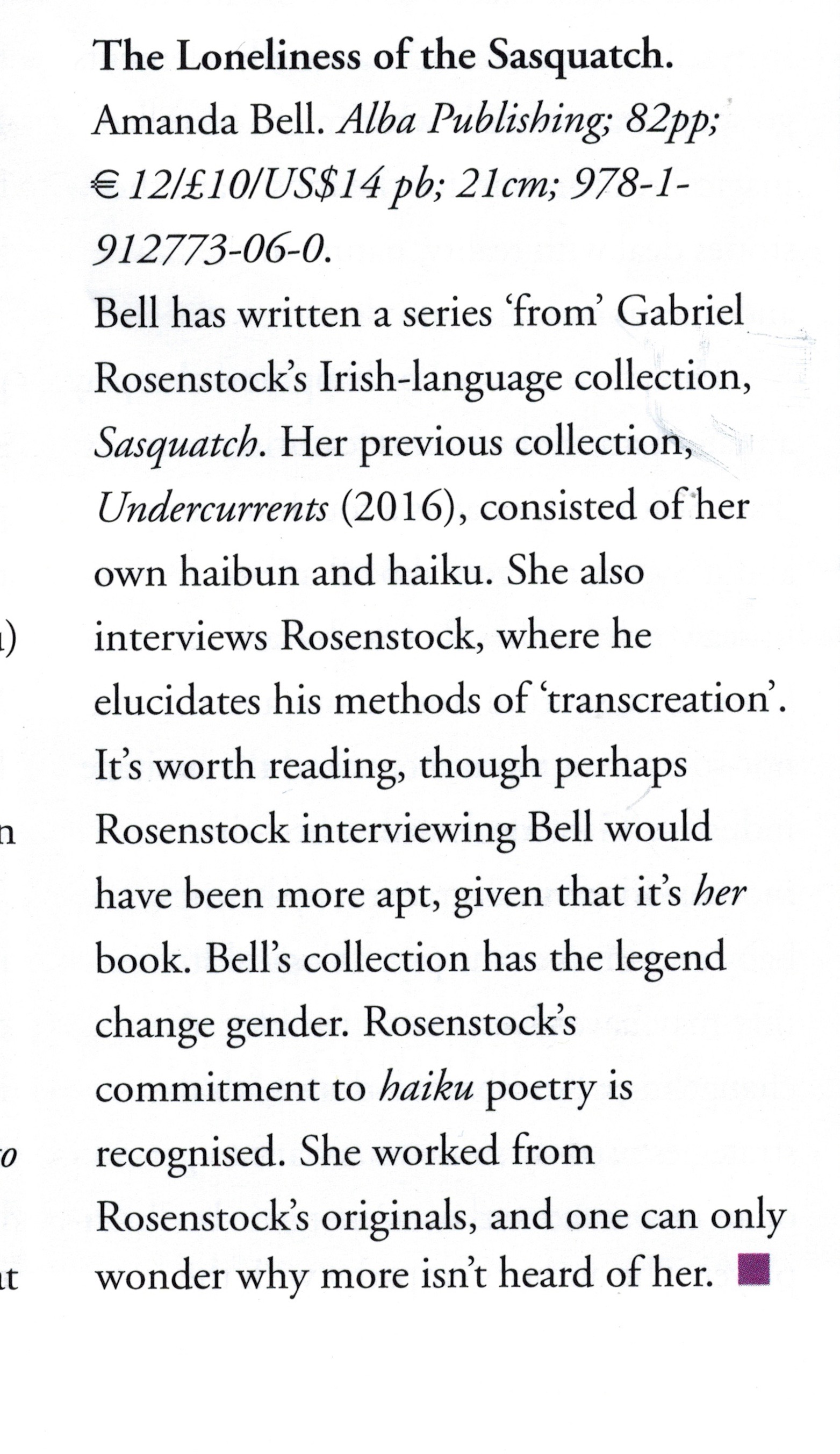 Amanda’s collection Undercurrents (Alba Publishing, 2016) is selected as Book of the Week at The Haiku Foundation. Thanks to poet and digital librarian Dan Cm[bell for his thoughtful essay: “Amanda Bell’s Undercurrents isn’t the kind of poetry collection that shouts for your attention—it quietly draws you in, like the soft murmur of water in the background. It’s the kind of book that asks you to slow down, sit still for a moment, and tune into the gentle rhythm of both nature and memory. In this collection of haiku and haibun, Bell creates a thoughtful link between Irish rivers and the deeper currents of memory and emotion, weaving them together with quiet grace.”