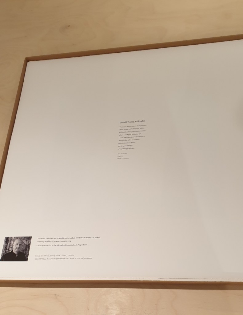 Amanda’s poem ‘Donald Teskey, Ballinglen’ was used as the colophon for a unique boxed set of carborundum prints by Donald Teskey produced by Stoney Road Press, which was presented by the artist to Ballinglen Arts Foundation in August. The poem has also been published by online literary journal The Phare