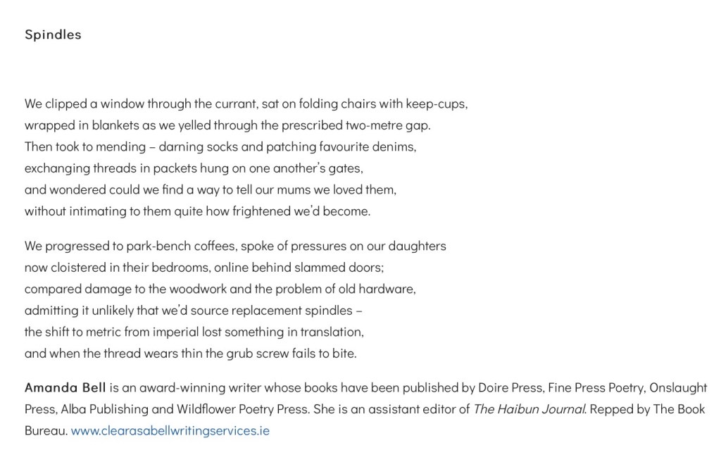 In January Amanda was a guest reader at a hybrid new year’s event organised by the Cercle Littéraire Irlandais. She had two haiku selected for the Museum of Haiku in Blithe Spirit, and her haibun ‘Visible Mending’ will be featured on the ‘Threads’ episode of Keywords, which is broadcast on RTE Radio 1 on Sunday evenings at 7pm.