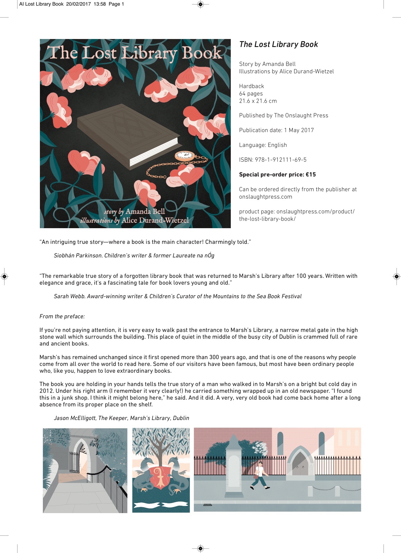 My children’s book, illustrated by Alice Durand-Wietzel and published by The Onslaught Press, was launched in Marsh’s Library on 20 May 2017. It is available from the publisher, in The Chester Beatty Library Bookshop, Books@One in Louisburgh, and in Marsh’s Library itself. It is distributed by Gardners and Bertrams, so can be ordered through any bookseller.